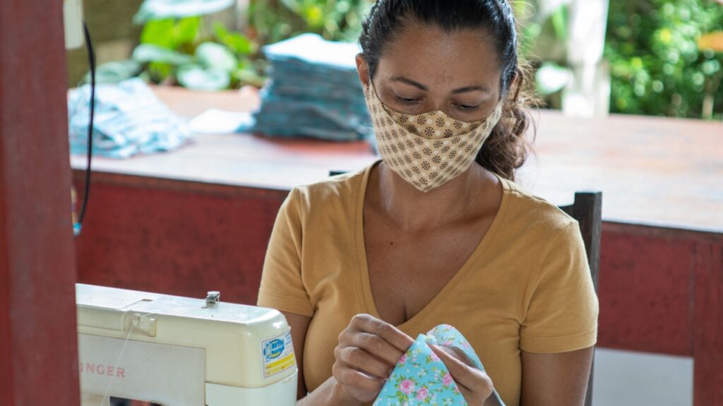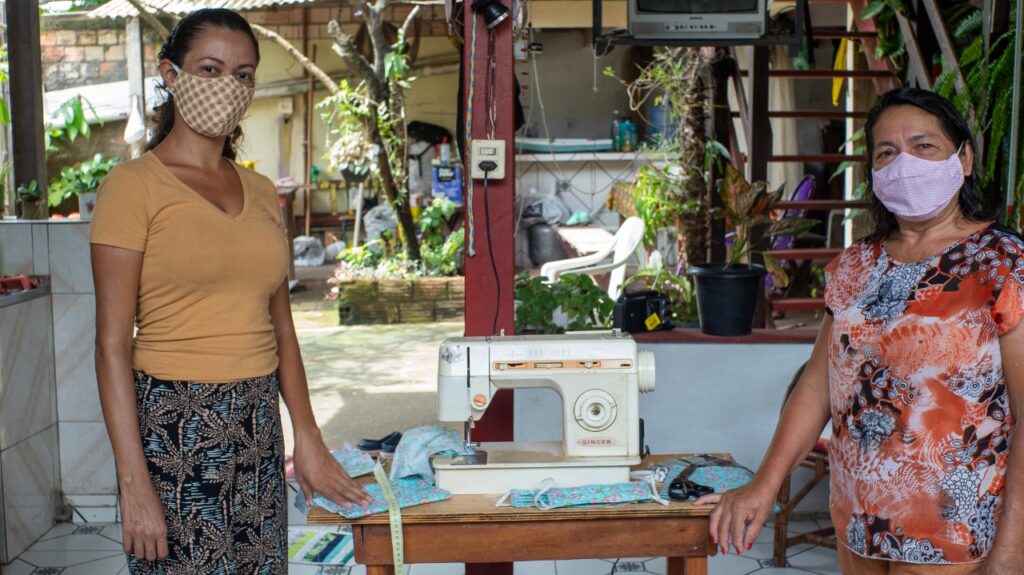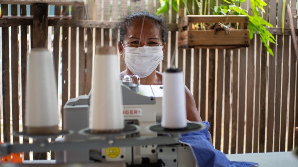 A pandemia que impactou a vida de toda a vila balneária, foi definida por Maria como uma “bomba” que forçou todos a procurarem uma nova forma de manter a renda. “Eram pessoas que tinham uma máquina em casa mas não sabiam nem pisar. Aí a gente foi formando grupos. Foi muito gratificante pra gente trabalhar com máscaras para o Saúde e Alegria. Foi gratificante pra Alter do Chão” – acrescentou.