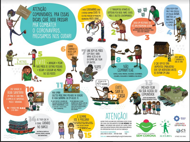 Também com uma linguagem voltada a realidade local, cartazes estão sendo distribuídos à medida que os itens de limpeza e higiene são entregues. Nesses folhetos estão disponíveis informações necessárias para manter o vírus longe da comunidade. Faça download aqui.
