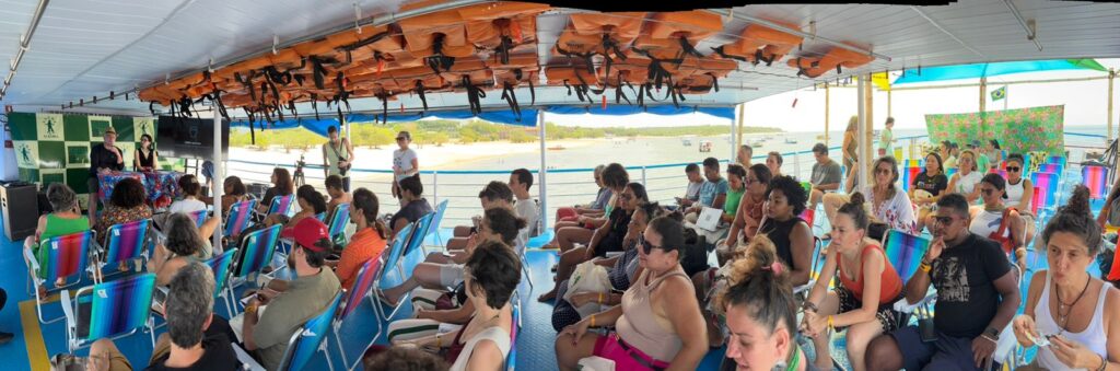 O primeiro dia começou com o encontro no barco, momento de acolhida, distribuição de kits e orientações de segurança. Às 9h30, foi realizada a sessão de abertura com o Projeto Saúde e Alegria, apresentada por Fábio Pena, seguida do painel “O recentramento do mundo, o recentramento do jornalismo”, com Eliane Brum e Jonathan Watts.