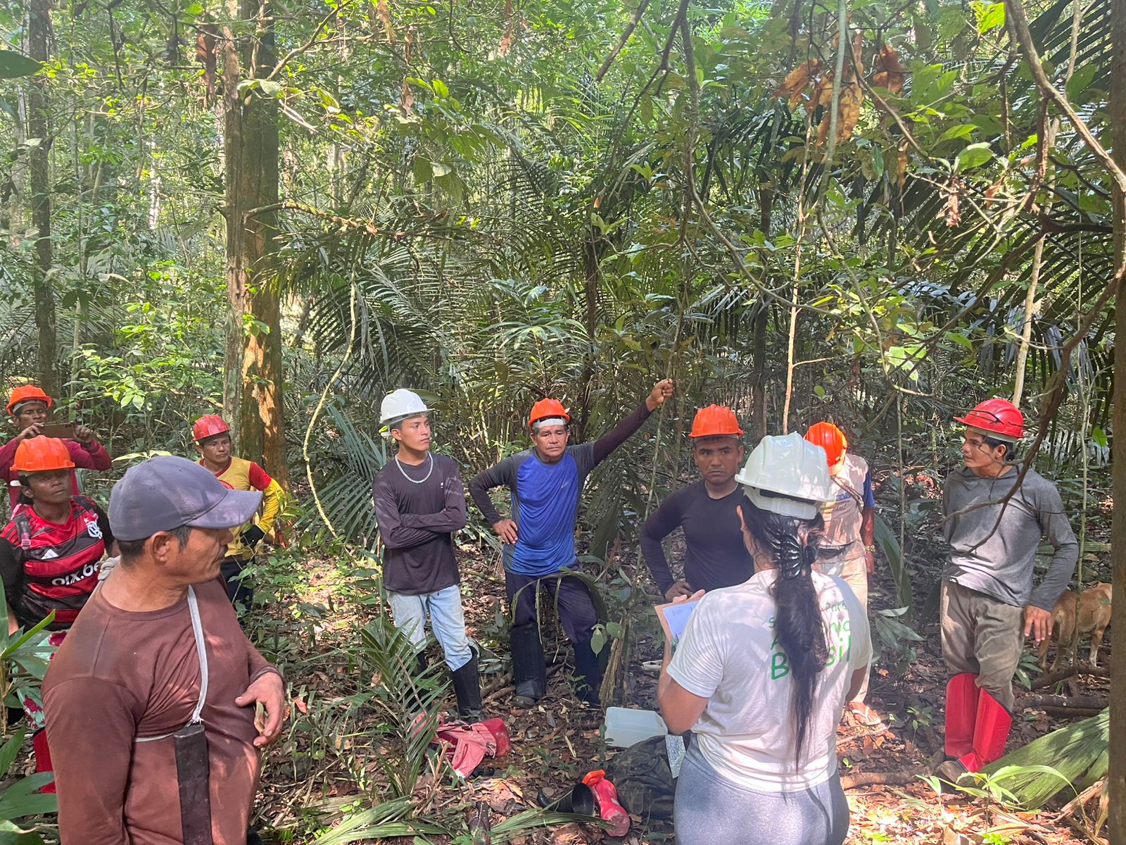 Entre os dias 6 e 10 de setembro de 2025, técnicos do PSA e da ACOSPER realizaram oficinas práticas e teóricas sobre o mapeamento e a extração do óleo. O treinamento, ministrado por Laura Lobato, Luís Carlos e Lorenaldo, com acompanhamento de José Maria, abordou o uso de GPS, o preenchimento de fichas de campo e a coleta de dados dendrométricos, seguindo o manual de mapeamento elaborado pelas instituições parceiras.