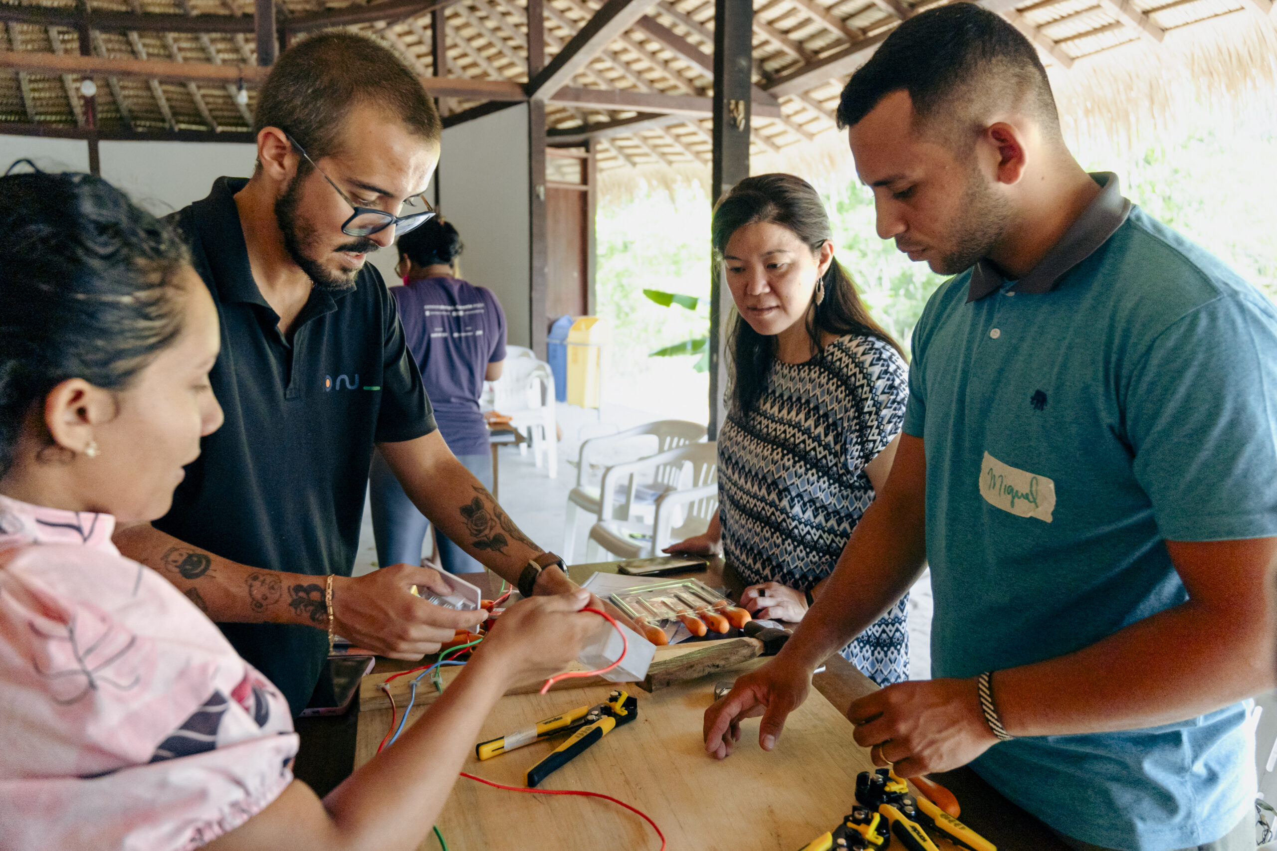 Na parte técnica dos sistemas fotovoltaicos off-grid, o engenheiro Gustavo Moncayo, da Ion Energia, trabalhou diretamente com a montagem, leitura e dimensionamento das instalações: “o curso acaba sendo extremamente importante para levar o conhecimento, espalhar para o pessoal conseguir compreender o material que tá chegando nas mãos deles”. Ele se surpreendeu com o envolvimento da turma: “Quanto mais a gente falava, quanto mais a gente explicava, mais eles ficavam com vontade de aprender, mexer e colocar a mão na massa, eles queriam entender. Eu achei isso muito bacana, a curiosidade deles, a vontade de aprender”.