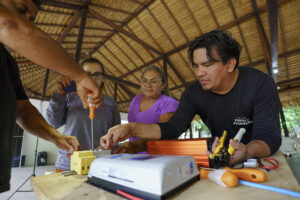 Uirá Tapuia, técnico que representa a Coordenação das Organizações Indígenas da Amazônia Brasileira (COIAB) aponta o curso como base para desenhar sistemas de energia adequados aos territórios e relaciona energia solar, crise climática e integridade dos territórios: “Então é muito importante esse sistema que a gente tá trabalhando que é de energia solar. Pensar em um sistema de energia solar, que seja fácil de transportar, de instalar e que os próprios parentes possam operar e fazer manutenção é muito importante”.