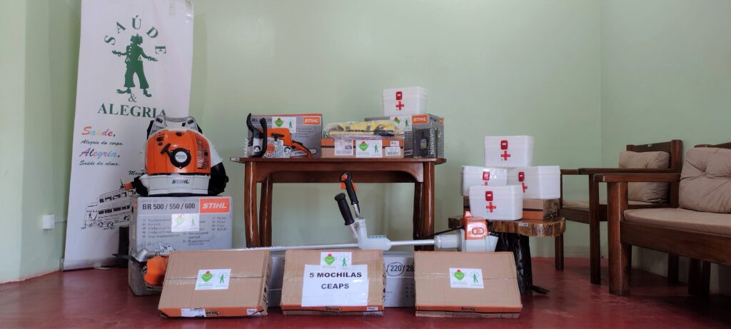 Para apoiar neste trabalho, foram entregues ao ICMbio na última terça-feira (30/12): Soprador Sthil BR 600, Motosserra Sthil MS 230, Roçadeira Shtil MS 220, Mochila costal flexível Guarany, GPS Garmim 64s e Kit para maleta de mão de primeiros socorros (compressas de gaze, termômetro, esparadrapo, algodão, antisséptico tópico, água oxigenada, solução fisiológica ataduras , álcool 70%).