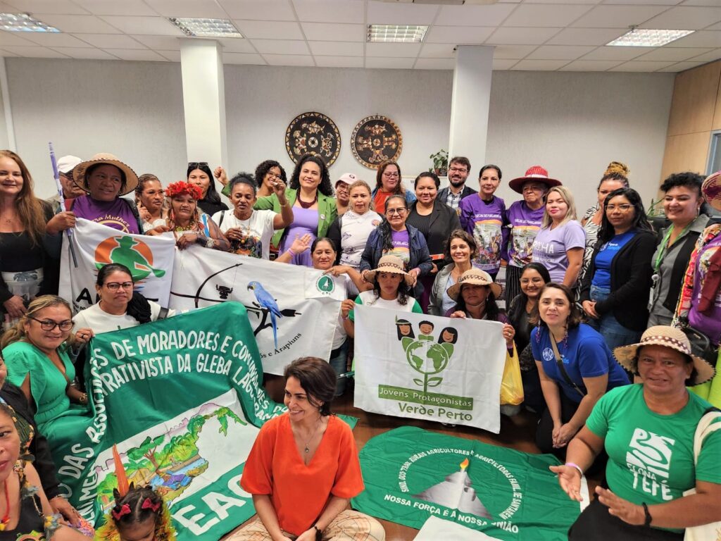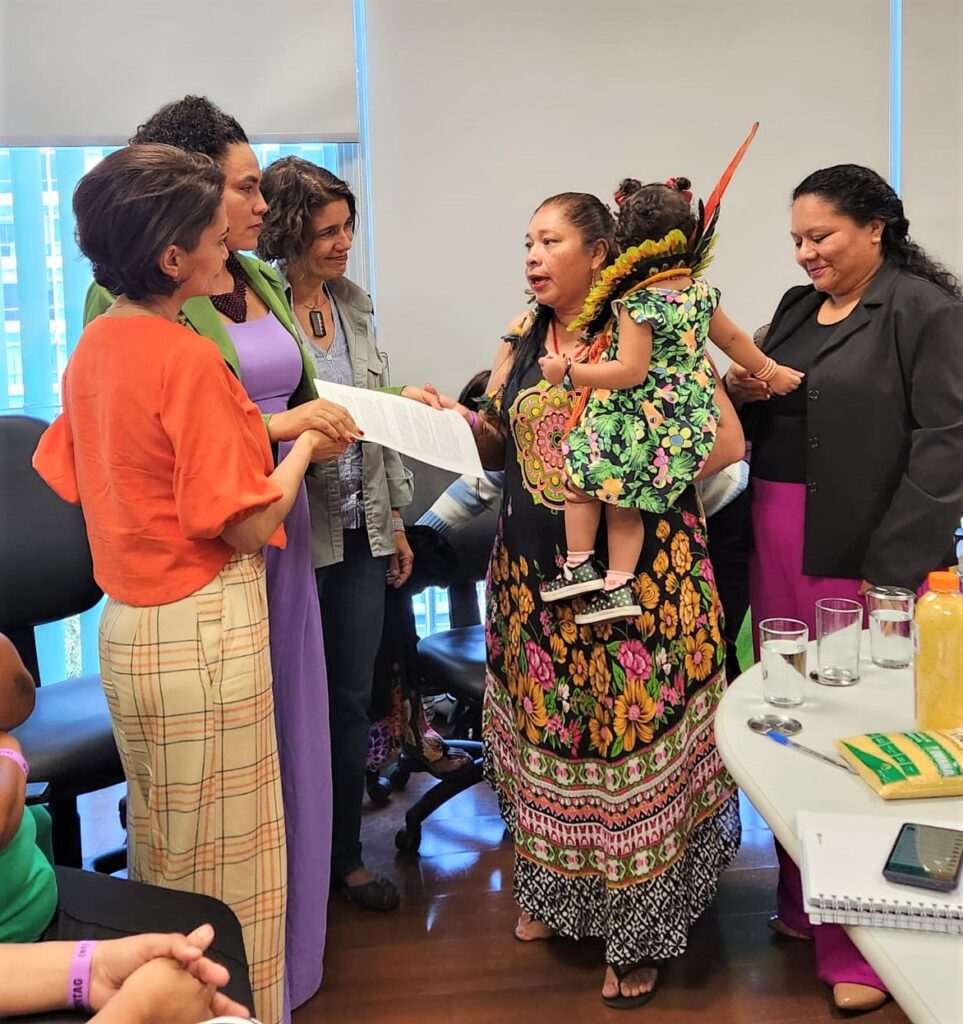 Documento elaborado ao longo de quatro encontros entre as mulheres empreendedoras da floresta, do campo e das águas, endereçada ao presidente Luiz Inácio Lula da Silva e a Ministra Cida Gonçalves foi entregue na Secretaria Nacional de Povos e Comunidades Tradicionais do MMA com pedido de investimentos para áreas prioritárias