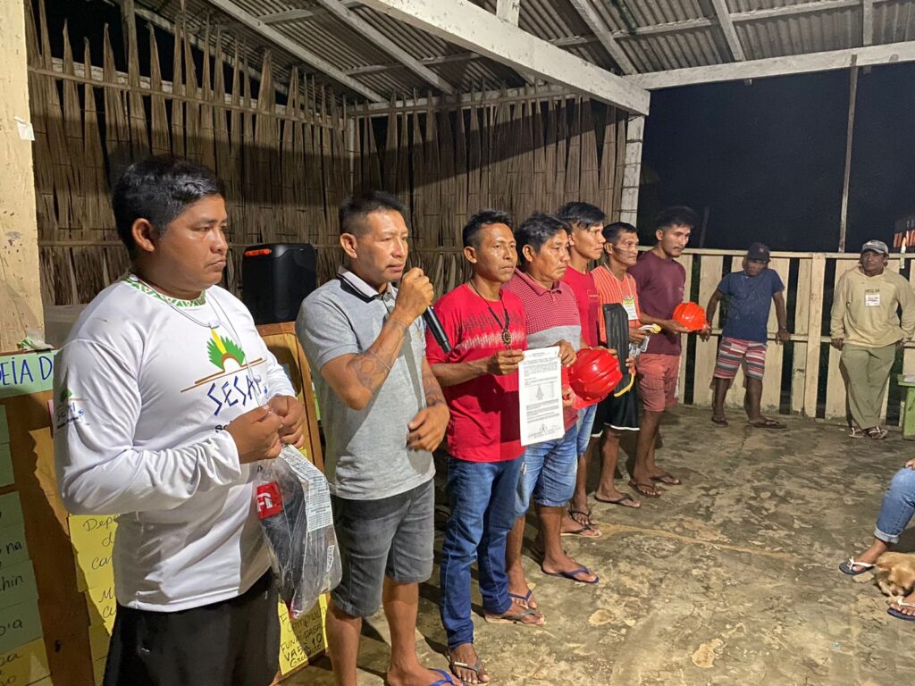Entrega dos EPIS aos indígenas do alto Tapajós durante criação do Coletivo em 2022.