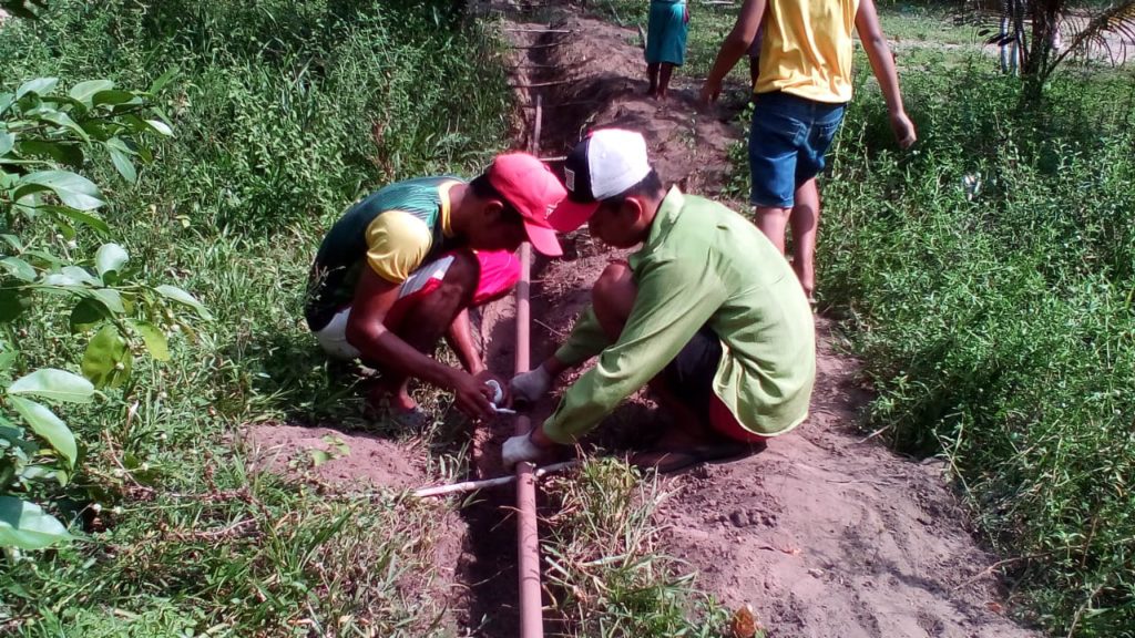 Em mutirões comunitários, os moradores escavaram o caminho para levar a rede hidráulica subterrânea para todas as casas. Assim, aprenderam juntos como funciona uma rede de abastecimento. Outra equipe trabalhava com técnicos na perfuração do poço e construção do elevado para instalara caixa d’água central.