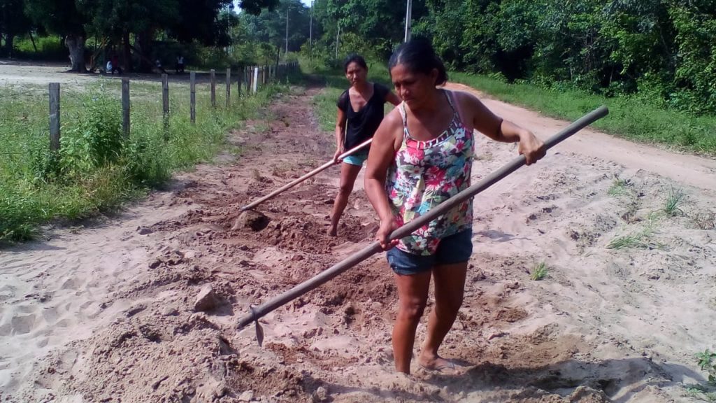 Comunidade reunida, divisão de tarefas e muito trabalho para homens e mulheres! É participação coletiva de quem será beneficiado pelo projeto de instalação hidráulica e sentimento de pertencimento como estratégia de empoderamento das comunidades da Amazônia.