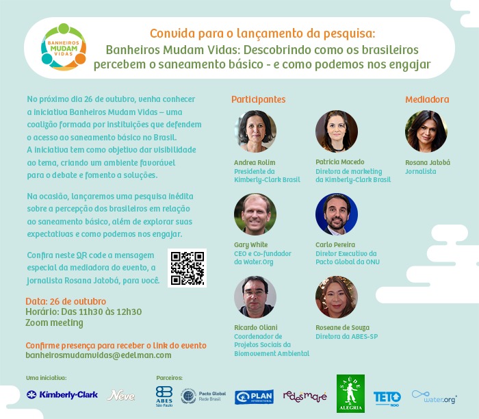 26 de outubro de 2021 – Sete em cada dez brasileiros não têm a real dimensão sobre a parcela da população desprovida de acesso a saneamento seguro.  25% não sabem nem se o esgoto de sua própria casa é tratado. É o que aponta a pesquisa “Banheiros Mudam Vidas: descobrindo como os brasileiros percebem o saneamento básico – e como podemos nos engajar”, desenvolvida pela Kimberly-Clark, por meio de sua marca Neve, em parceria com a consultoria Grimpa. O estudo inédito marca o lançamento da nova fase do programa Banheiros Mudam Vidas no Brasil, que passa a se posicionar como um movimento articulador, reunindo parceiros importantes ao redor de diálogos e soluções sobre o saneamento básico no país.