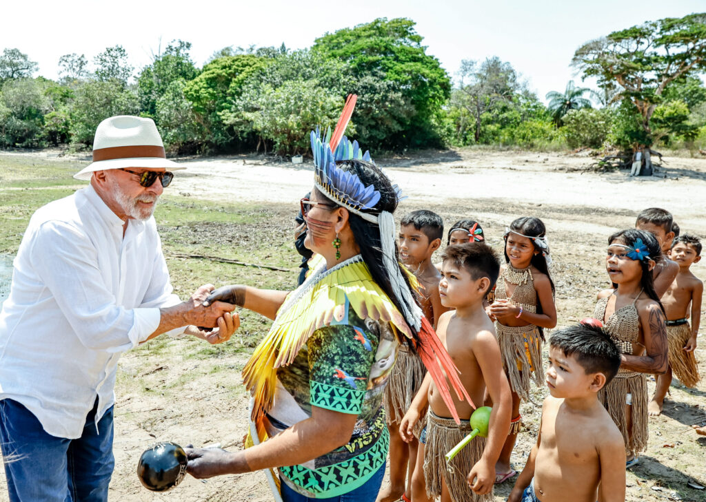 Durante visita à aldeia Vista Alegre do Capixauã, o presidente Luiz Inácio Lula da Silva ouviu lideranças indígenas como a cacica Irenilce Kumaruara e conheceu iniciativas apoiadas pelo Fundo Amazônia e pelo Programa Cisternas, que integram o corredor de tecnologias sociais do Tapajós. Foto: Ricardo Stuckert.