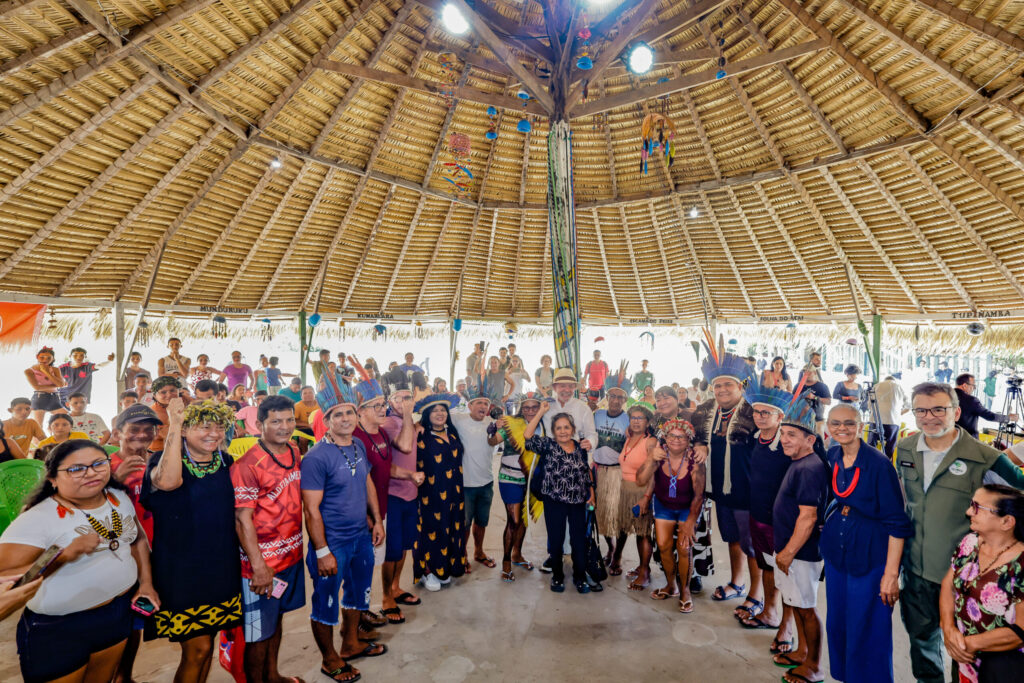 Lideranças indígenas, ribeirinhas e representantes do governo federal se reuniram na aldeia Vista Alegre do Capixauã, em Santarém (PA), para dialogar sobre políticas públicas e conhecer tecnologias sociais que fortalecem a vida nas comunidades do Tapajós. Foto: Ricardo Stuckert.