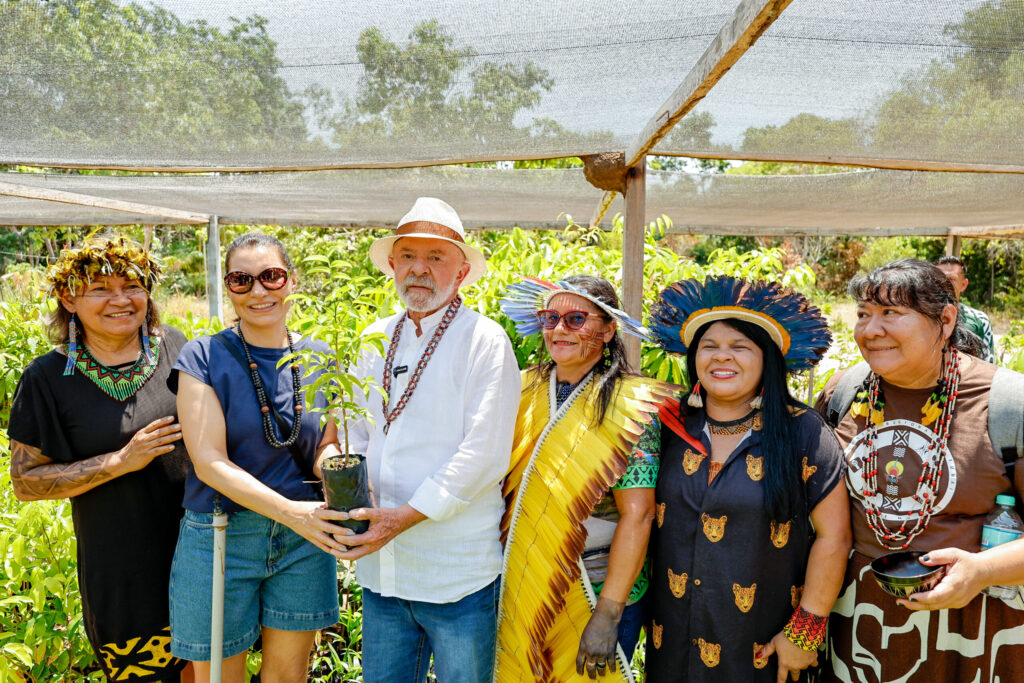 Durante a visita ao corredor de tecnologias sociais do Tapajós, o presidente Lula conheceu o viveiro florestal de Vista Alegre do Capixauã, tecnologia social apoiada pelo Fundo Amazônia/BNDES. Foto: Ricardo Stuckert.