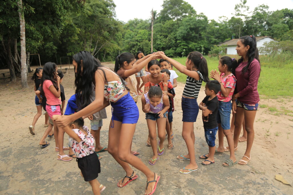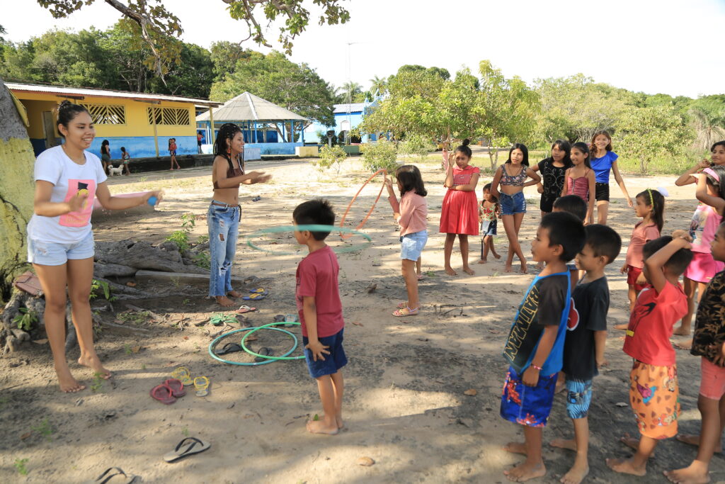 Enquanto os adultos participam do diagnóstico, as crianças brincam com os arteeducadores. Joane Bentes, da comunidade Suruacá, ressalta que esse é um momento importante para garantir a participação tranquila dos pais, e estimular o brincar entre os pequenos. “Essa ação nas Comunidades tem um impacto positivo dentro das comunidades e aldeias porque mostra como cuidar das nossas crianças de forma que elas não sofram violência e que os pais saibam identificar quando uma atitude está sendo ou não violenta. A gente faz uma troca de experiência”, diz a Arteeducadora.