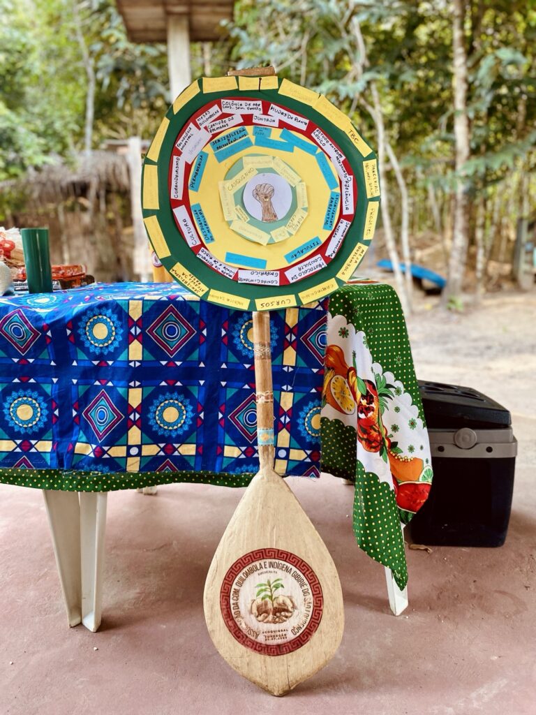 “Nós vivemos aqui hoje imprensados por conta dos empreendimentos das indústrias que se instalaram aqui. Mas independente disso, a gente não parou no tempo, não se acomodou, tá aí trabalhando e buscando resgatar os direitos que nós temos. Para que dê continuidade na nossa cultura, a gente valoriza muito a parte cultural, o carimbó que as meninas dançam. Tem um grupo de mulheres aqui que são bem engajadas e que consideram como uma terapia a dança, incentivadas pelo grupo de carimbó Arirambas e Botos. Então, esse entrosamento entre nós, a natureza, e a floresta, com certeza nos satisfaz e nos deixa melhor” contou a liderança de mulheres do Quilombo, Josinete Santos.