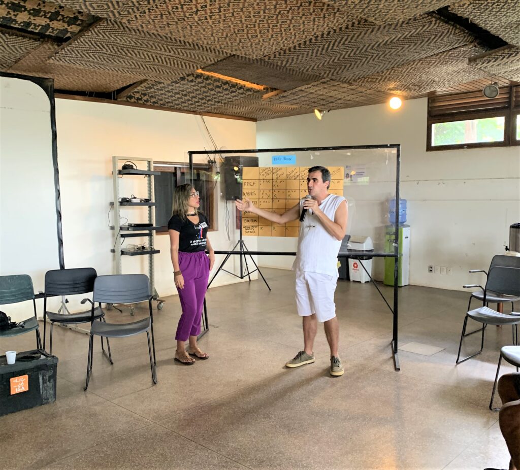 Adriane Gama e Guilherme Gitahy durante conversa com os alunos na atividade da Escola de Redes Comunitárias da Amazônia.