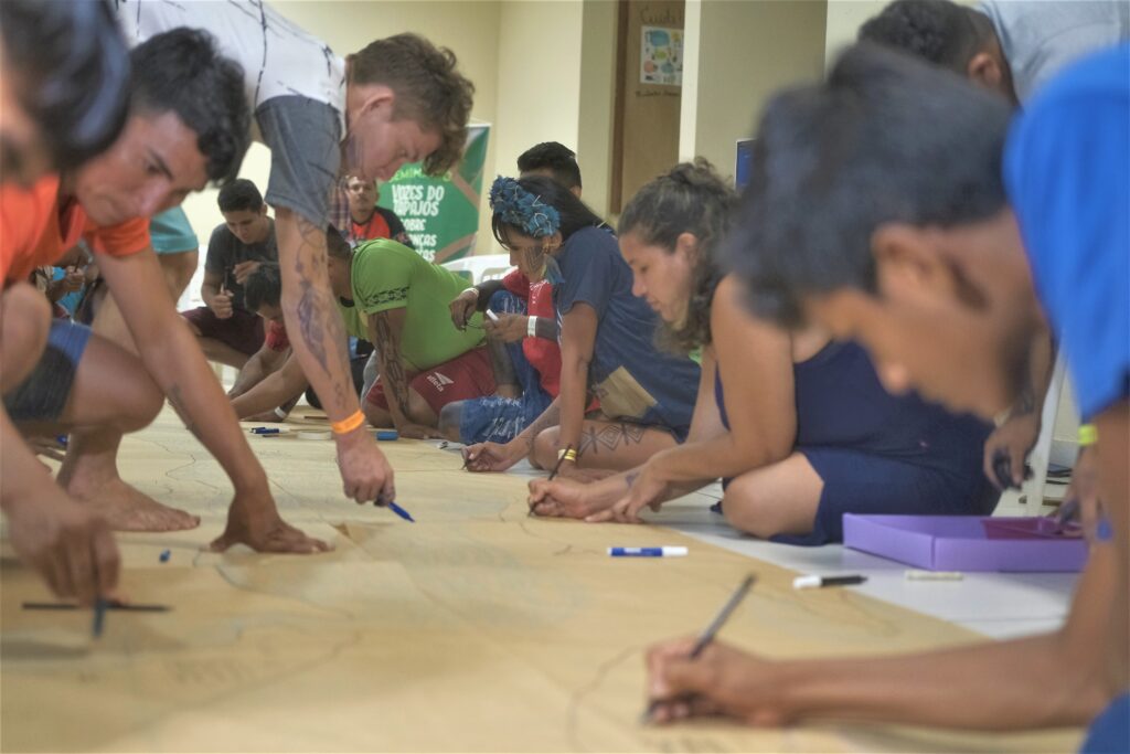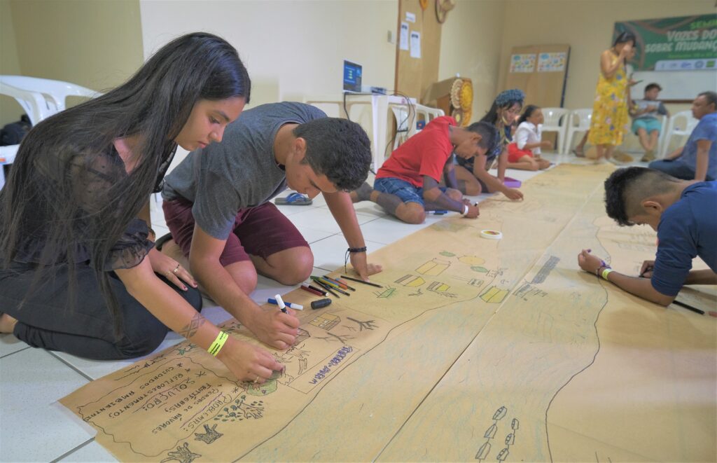 Um grande mapa representando o rio Tapajós, Arapiuns e Amazonas, integrou as diferentes comunidades participantes do seminário que debateu as mudanças climáticas na região Oeste do Pará. A dinâmica foi uma das ações realizadas no evento, que buscou mapear a situação de cada uma das aldeias e comunidades, ligadas aos efeitos das mudanças climáticas.