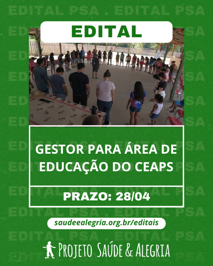 O Centro de Estudos Avançados de Promoção Social e Ambiental – CEAPS torna público o Termo de Referência Nº019/2025 para contratação de um(a) GESTOR/A PARA A ÁREA DE EDUCAÇÃO do Projeto Saúde e Alegria, para desenvolver e acompanhar metodologias pedagógicas, participativas, lúdicas, para atividades ligadas à ações educativas em projetos socioambientais e gestão da equipe, […]