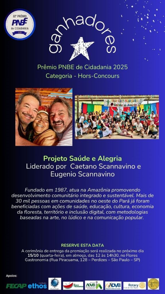 O Projeto Saúde e Alegria foi um dos vencedores do Prêmio PNBE de Cidadania 2025, concedido pelo Pensamento Nacional das Bases Empresariais (PNBE). A organização foi homenageada na categoria especial “Hors-Concours”, reconhecimento destinado a iniciativas de destaque nacional e trajetória consolidada. “A gente fica muito feliz com a homenagem. Um prêmio de abrangência nacional agraciando […]