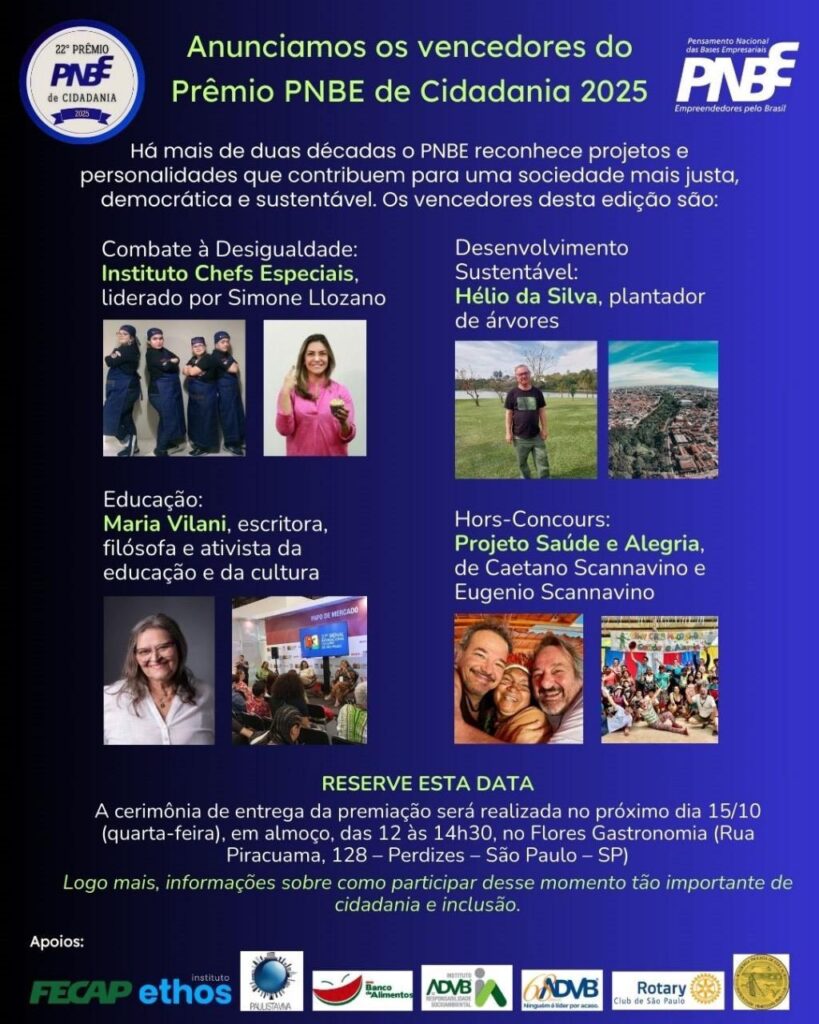 O Prêmio PNBE de Cidadania, que chega à sua 22ª edição, reconhece há mais de duas décadas projetos e personalidades que contribuem para uma sociedade mais justa, democrática e sustentável. Além do Projeto Saúde e Alegria, foram premiados em 2025: Combate à Desigualdade: Instituto Chefs Especiais, liderado por Simone Lozano, Educação: Maria Vilani, escritora, filósofa e ativista da educação e da cultura e Desenvolvimento Sustentável: Hélio da Silva, conhecido por seu trabalho de reflorestamento e plantio de árvores.