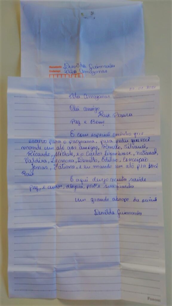 Duvilda Guimarães, moradora da comunidade fez questão de enviar um alô direcionado para amigos e para a equipe do programa. Na carta disse: “É com especial carinho que escrevo para o programa, para pedir que você mande um alô aos amigos: Renato, Natanael, Valdira, Leonara, Denilto, Edilso, Conceição, Jonas, Fátima e eu mando um alô pra você. E aqui desejo muita saúde, paz, amor, alegria pra você e sua família”.